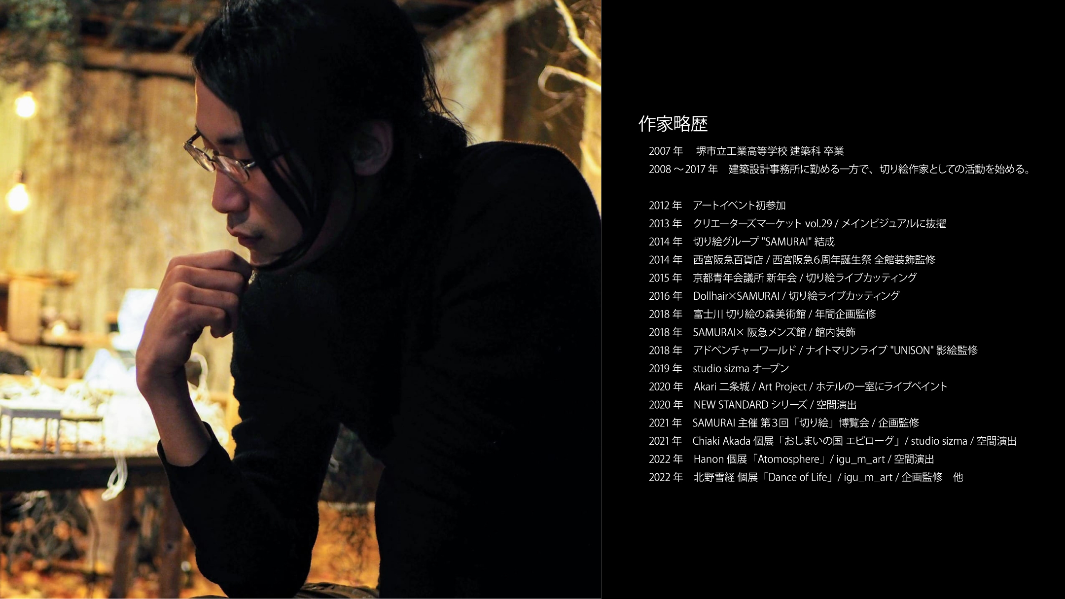 切り絵の持つ「もともとある素材から余分なものを削ぎ落として完成に至る」という過程に惹かれ、やがて影というテーマに辿り着いた。
